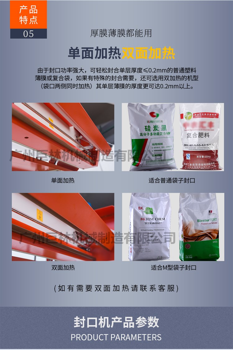 • 該系列封口機采用電子恒溫控制和無級調速傳動系統,具有自動連續封口、印刷產品標簽、一次完成之功能,并可臥、立落地使用。用于單層薄膜及各種復合薄膜的封口、制袋,廣泛應用在食品、制藥、種子、化工、輕工等部門。